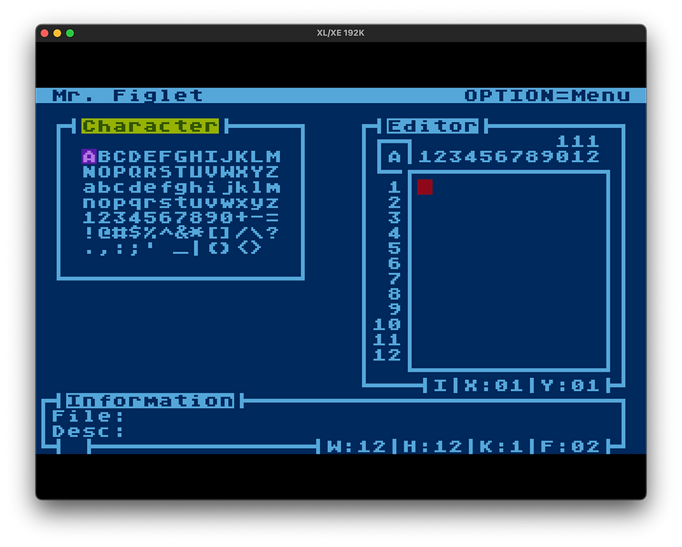 I'm in the process of making the figlet editor parts work now. The edit commands may grow or shrink based on what I feel is needed after working with it. One thing missing off the File menu is Print. Ooops, oversight. Print may have a requirement to be output to an emulated ATASCII printer for ease of implementation. I don't think I want to get into bitmapping graphic chars to dot matrix. I did that back in the 80's and remember it being incredibly time consuming. So printing to Atari800MacX ATASCII printer would be a piece of cake on the A8 side and give a good output that can be saved as PDF.